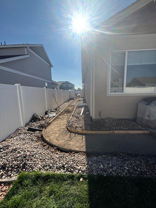 This Windsor property had a narrow side yard filled pretty much with loose rock, uneven ground, and minimal access between the house and the neighboring fence. Our plan was to design and pour a new concrete sidewalk that would: